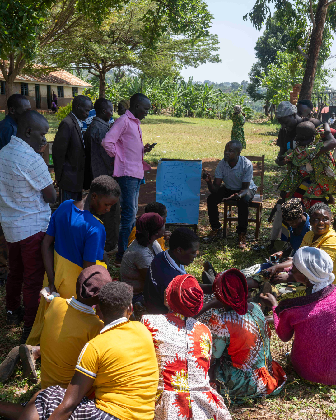 Elke maand bezoekt iemand van ons lokale team de gemeenschappen om opvolging te doen en extra ondersteuning te bieden. En dat is precies wat je hier ziet dat Eddy doet, midden op de foto.