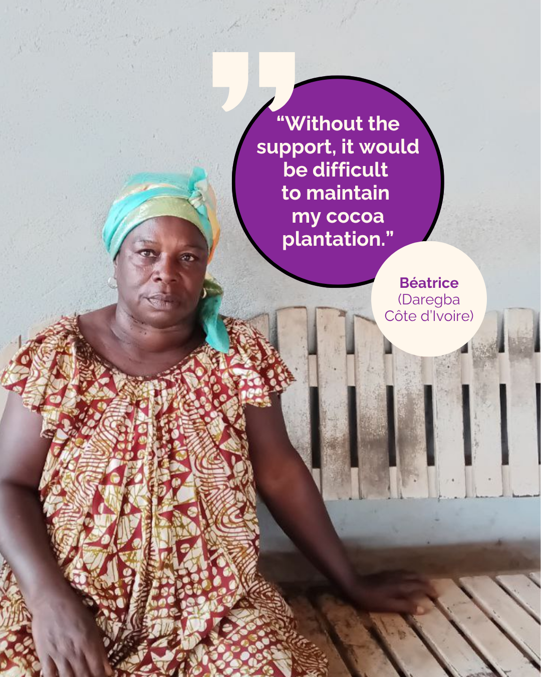 Béatrice is een cacaoboerin die hard werkt om haar plantage te onderhouden en haar gezin te ondersteunen. Met maandelijkse financiële steun van Eight heeft ze kunnen investeren in meststoffen en behandelingen om haar productie te verbeteren. Deze steun geeft haar meer stabiliteit en hoop op een betere en meer zekere toekomst.